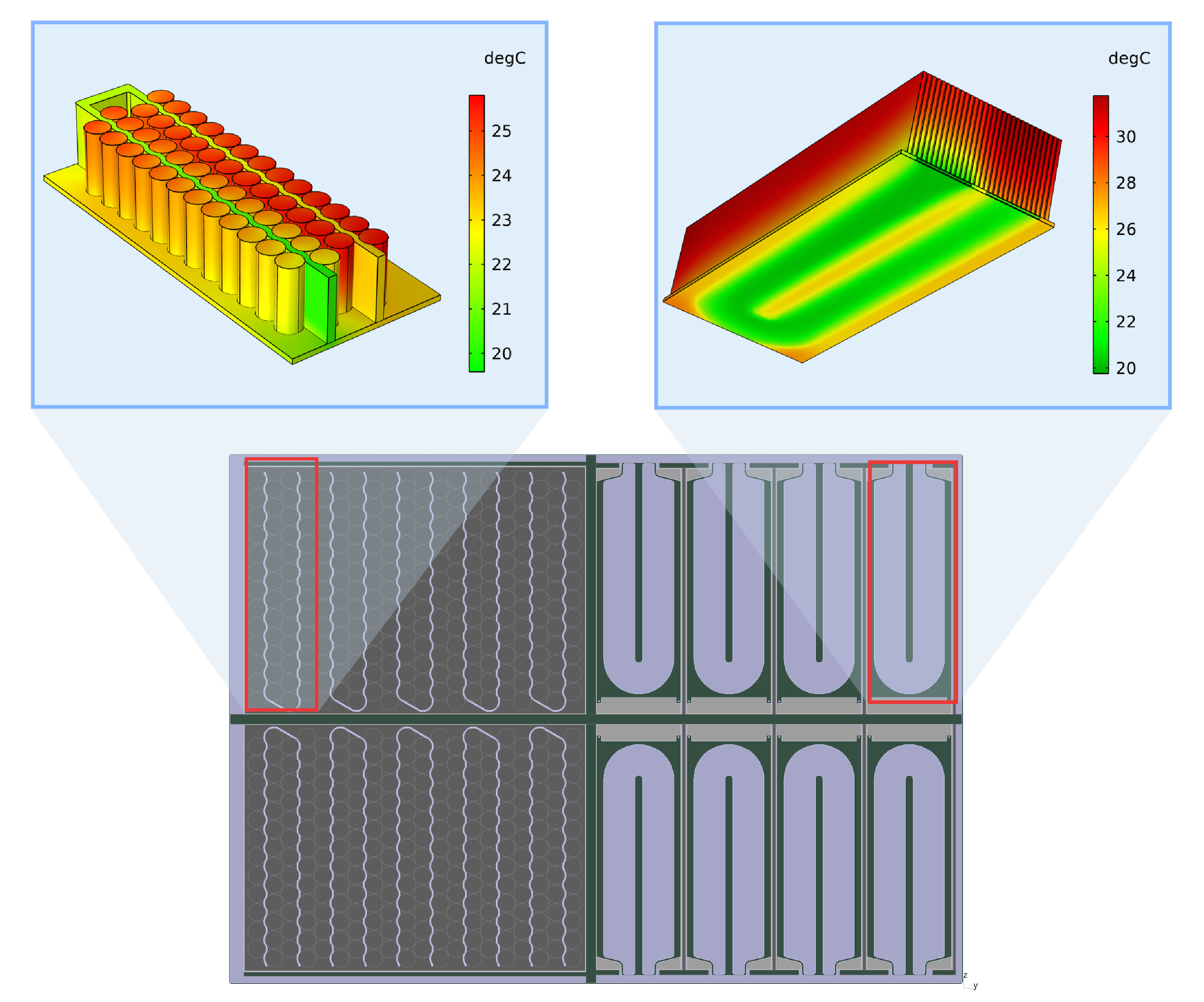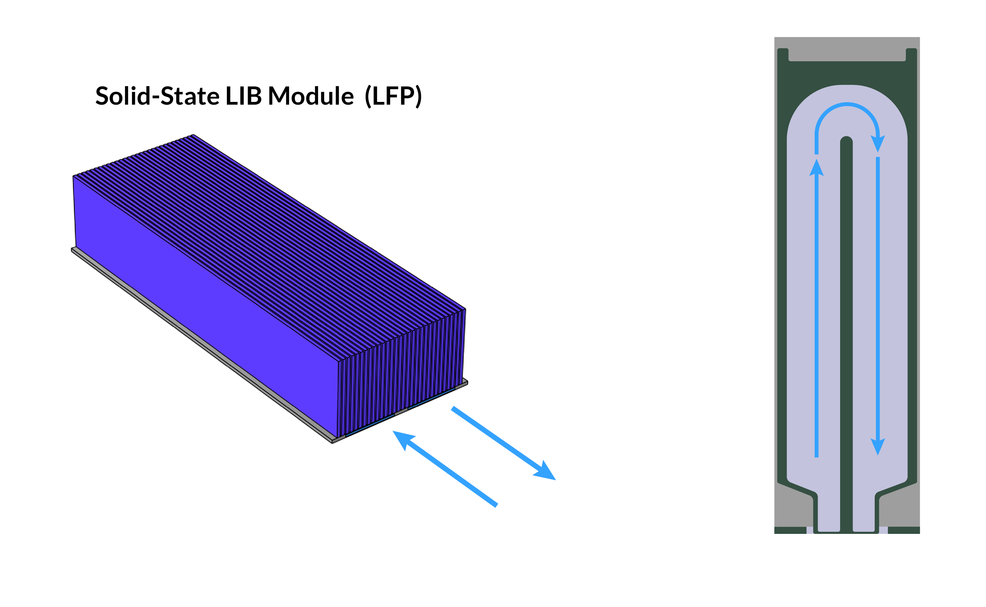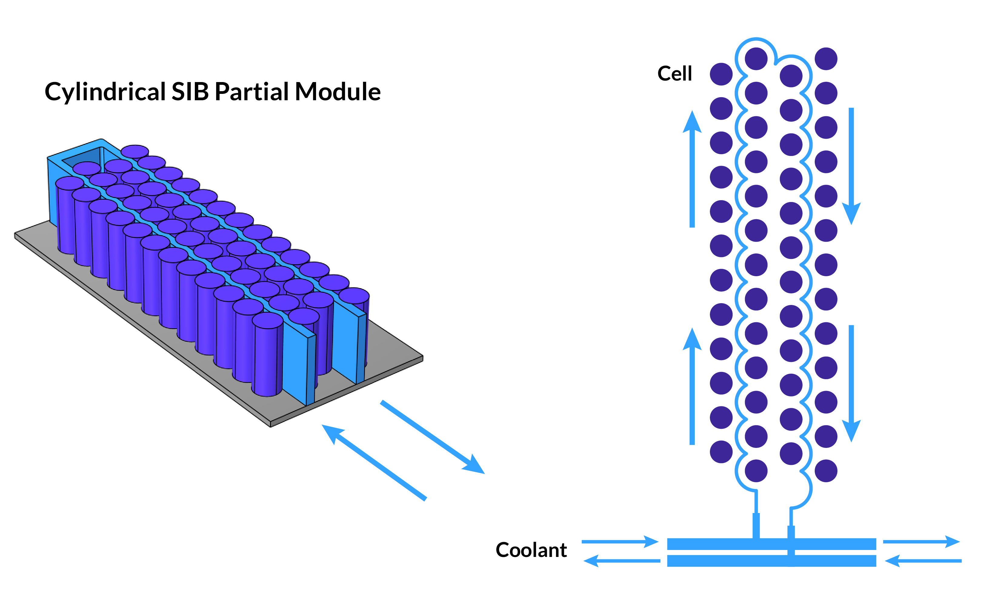 Cells with liquid electrolyte have limited thermal stability and require cooling (true for both sodium and lithium cells), and temperatures above ~60°C need to be avoided. Solid-state cells can operate at higher temperatures because of their solid electrolyte, and these need an elevated temperature to reach usable ion conductivity. Therefore, the SIB cells in this concept need cooling while the SSB cells need heating, and both cells benefit from the mutual heat exchange. IAV engineers knew that this interaction in particular would be a significant optimization challenge and felt that modeling and simulation would be essential to easing the complexity. For this, the team turned to the COMSOL Multiphysics® software.