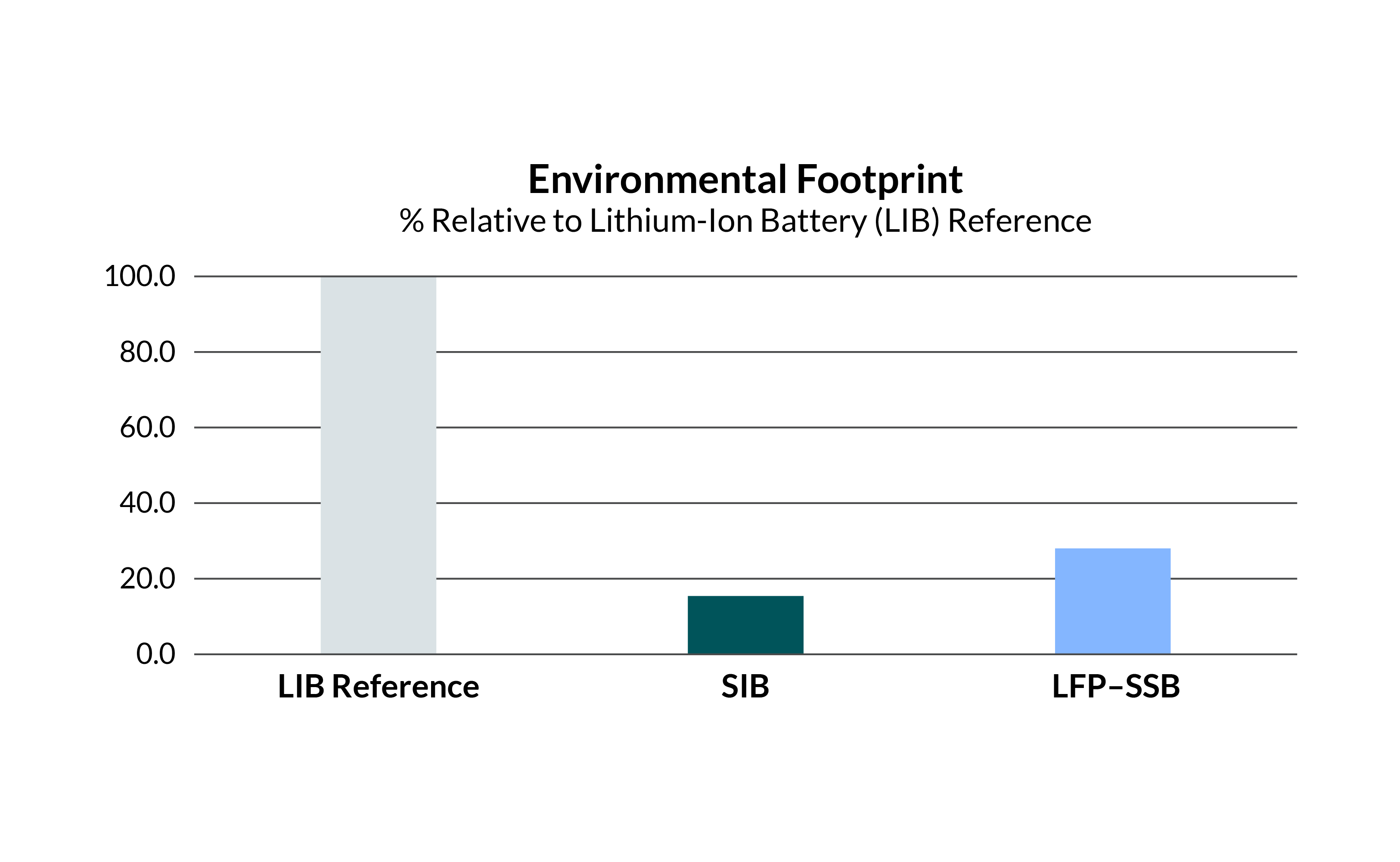 Instead, the team at IAV chose to pair a sodium-ion battery (SIB) and a lithium iron phosphate (LFP) solid-state battery (SSB) for its design because of the chemistries' unique ability to complement one another. SIBs are typically cheaper, more sustainable to source, and easier to recycle than conventional lithium-ion batteries4; however, they tend to have comparatively lower energy density and a shorter cycle life. Meanwhile, traditional LFPs are known for their stability and long cycle life but also lack in energy density when compared to conventional lithium-ion batteries. Finally, SSBs are known for having higher energy density than traditional lithium-ion battery chemistries. By combining an SIB with an LFP-SSB, the resulting design should theoretically have an improved environmental footprint (Figure 2), cost less money to create, and feature a relatively strong energy density for demanding applications such as powering EVs.