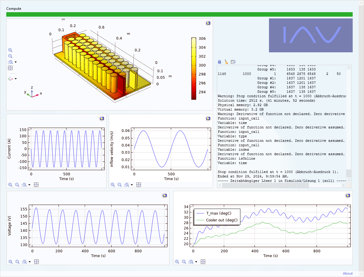 Apps that are used internally at IAV are often designed for cosimulation with COMSOL Multiphysics® and external toolchains and are routed through IAV‘s virtual test bench interface. Figure 6 shows an example battery module app used for cosimulation, which provides basic user feedback about the internal states of the models like current, voltage, temperatures, etc. App results are provided as a real-time data stream to other programs in the cosimulation framework, where detailed evaluation of results is performed.